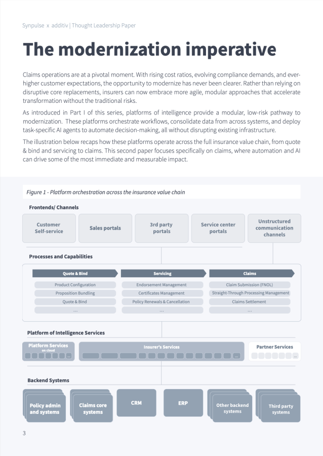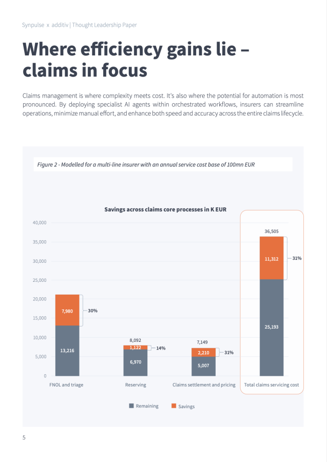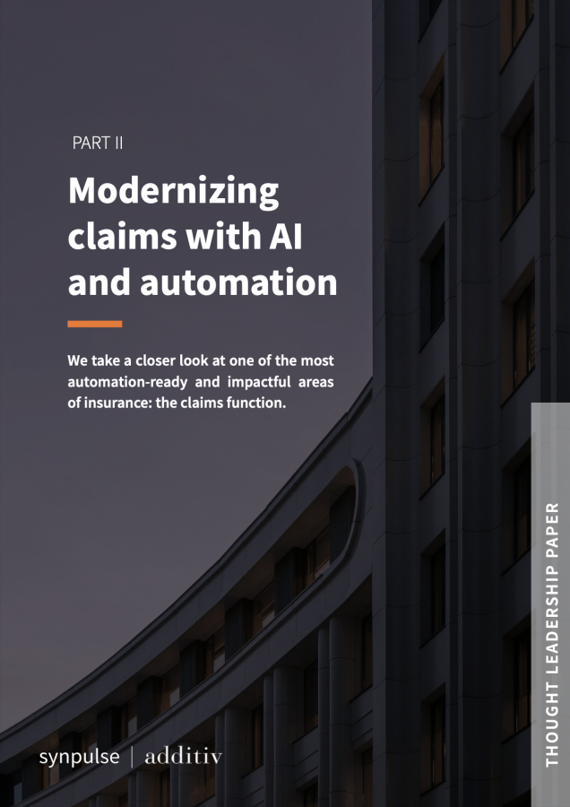 This paper, the second in a thought leadership series from Synpulse and additiv, presents the findings of a claims-specific benchmarking study building on an analysis of over 190 insurance processes. It shows how insurers can unlock rapid, measurable value by automating and orchestrating claims workflows and embedding AI into day-to-day operations — without replacing existing core systems.
